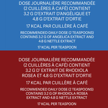 Ingrédients - Energie: glycérine végétale, ortie, racine de Rhodiola rosea.